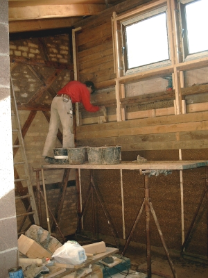 stampflehmarbeiten, zum einsatz kam ein selbst gemischter hanfleichtlehm mit einer rohdichte unter 600gk/kbm,, die wände wurden anschließend mit lehm verputzt